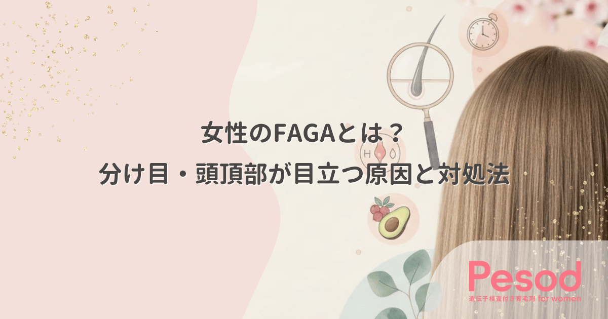 女性のFAGAは加齢やホルモンバランスの変化で頭部全体の髪が細くなる症状です。男性の薄毛と違い、特定部位が完全に消失するのではなく地肌が透けて見える特徴があります。